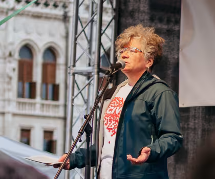 Móra Veronika, az Ökotárs Alapítvány igazgatójának beszéde a 2025.05.18-án a leszámolási törvénytervezet elfogadása ellen tartott demonstráción a Kossuth téren.